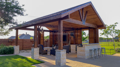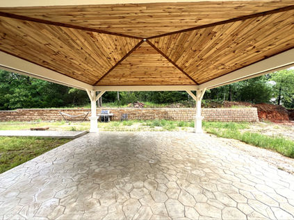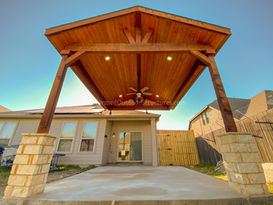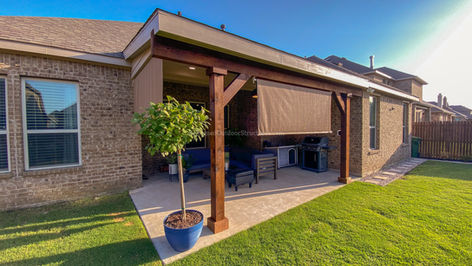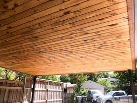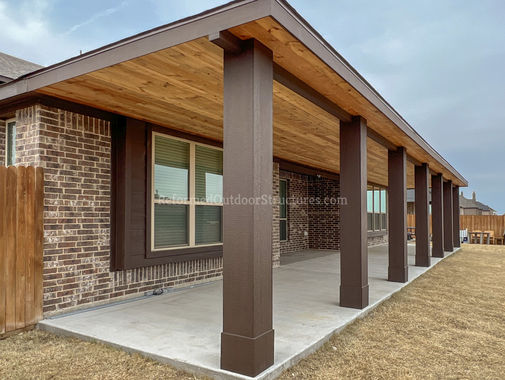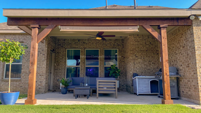Traditional patio covers are classic outdoor structures designed to provide shade and protection from the elements while complementing the architectural style of the home. Typically constructed from wood or vinyl, they often feature decorative elements like columns, latticework, or gabled roofs that evoke timeless charm. These covers may be attached to the house or freestanding, and are commonly built with fixed roofs or open-beam designs that support climbing plants or hanging lights. While they prioritize function and comfort, traditional patio covers also emphasize craftsmanship and ornamental detail, creating cozy, inviting spaces for relaxation and gatherings. There are many ways to "Finish Out" your custom patio cover. You may prefer a tongue and groove flat ceiling to give your patio cover a modern look, while others prefer the more rustic look with visible cedar rafters. Our knee braces can have a design cut. We have a variety of stain colors to choose from. All of this is amendable to fit your most particular intentions.